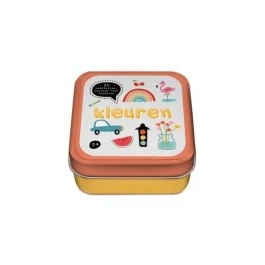 Blik met 50 spelletjeskaarten voor kinderen met als thema Kleuren.