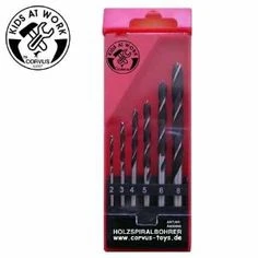 Deze set van 6 houtboren kun je plaatsen in de handboormachine voor kinderen van het duitse merk Corvus. Daarmee kunnen ze elk gewenst gaatje boren in hout. Boormaten: 2 – 3 – 4 -5 – 6 – 8 mm.