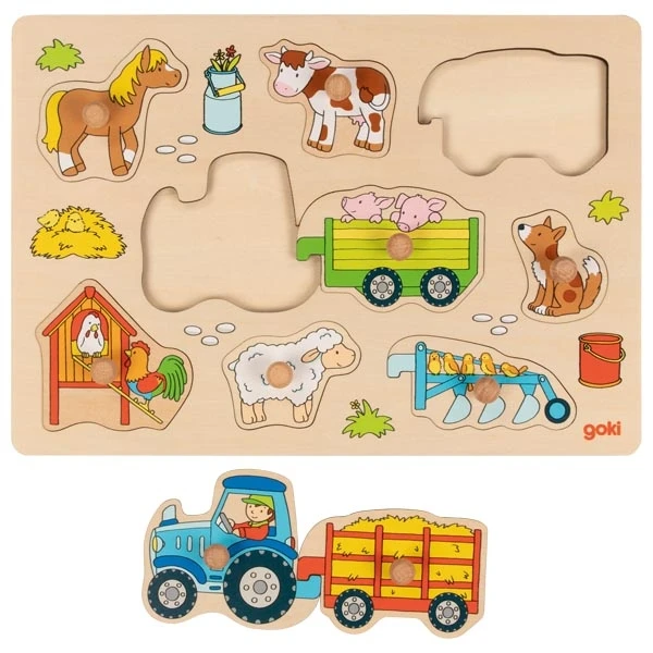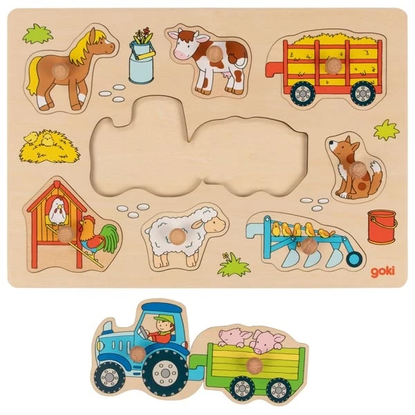 Houten noppenpuzzel met 9 puzzelstukken in het thema boerderij. De aanhangwagens passen beiden achter de traktor.