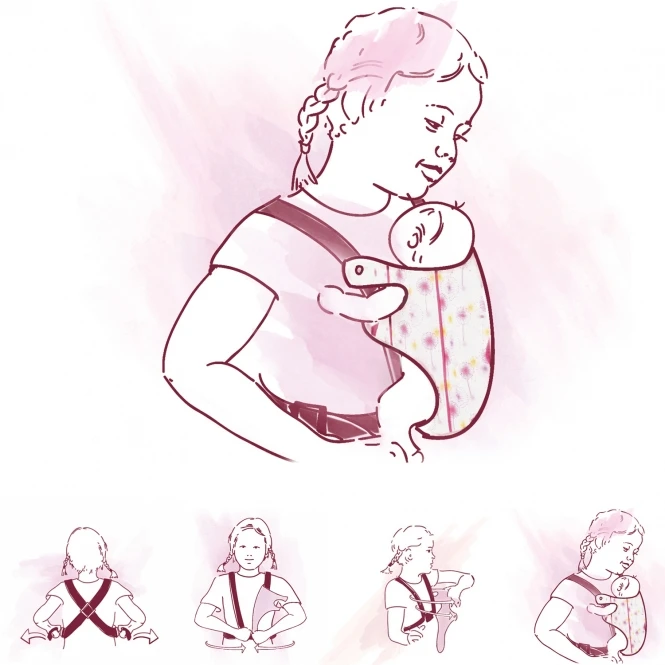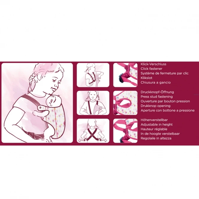 Als je gaat wandelen, kruipt je babypop tegen je aan en heb je je handen vrij.ย Een praktische drager in zachte kleuren.ย Je hebt maar een paar klikken nodig tot de drager goed past en je pop een veilige zitplaats heeft.