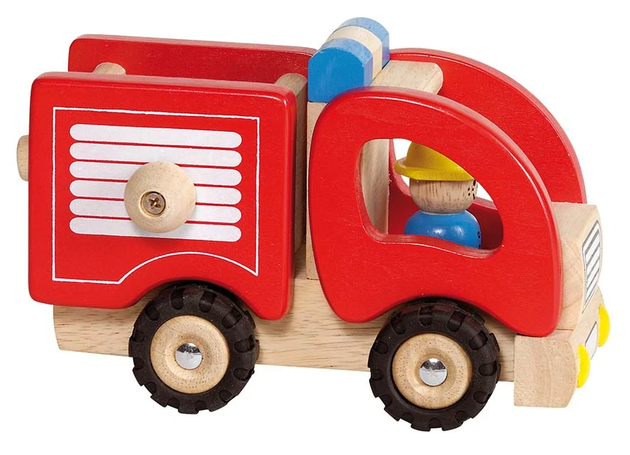 Robuuste houten brandweerauto met rubber banden. Voorzien van “brandweerslang” . Afmetingen: 16,7 x 9,1 x 10,5 cm.