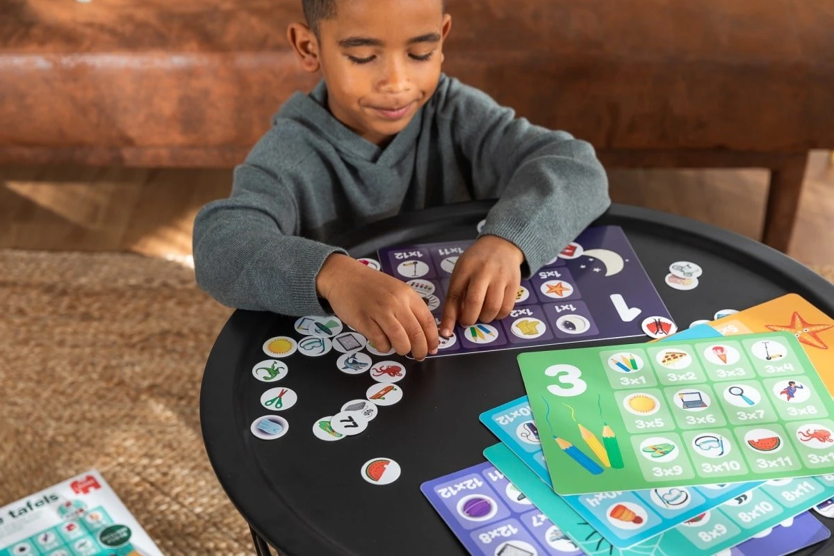 Leer met behulp van 2 spelletjes en de poster de tafels van 1 tot en met 10. Weet jij de antwoorden op de sommen? Zoek de juiste getal-fiches en leg ze op de kaart. Controleer je uitkomst door het fiche om te draaien. Komt het plaatje overeen? Dan is het antwoord goed! Inhoud: 5 dubbelzijdige tafelkaarten 42 getal-fiches dubbelzijdige tafelposter Spelregels Ontworpen en gefabriceerd in Nederland