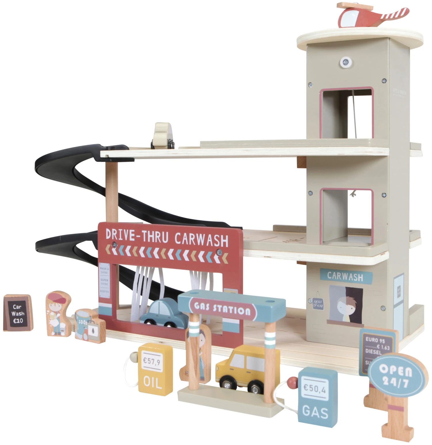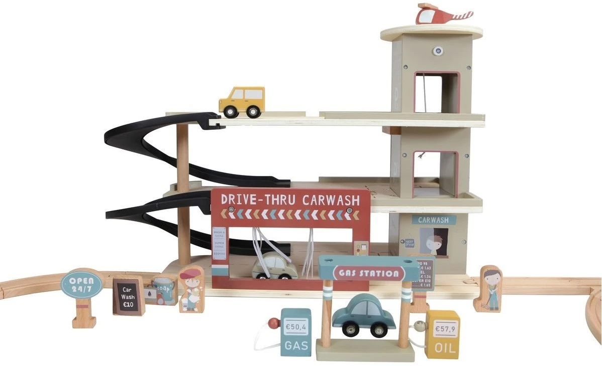 Stop bij de garage om benzine te tanken, je auto te parkeren of laat ‘m schoonmaken in de wasstraat. De uitbreiding bevat een garage met carwash, auto’s, helikopter, benzinestation, pompen, borden en medewerkers. De houten garage is één van de vele speelsets die gekoppeld kan worden aan de treinset XXL van Little Dutch. Op de garage vind je een helikopterplatform en de houten figuren zijn aan beide kanten voorzien van een gedetailleerde illustratie. Je maakt de garage helemaal af met de treinset XXL en de uitbreidingssets voor uren speelplezier.