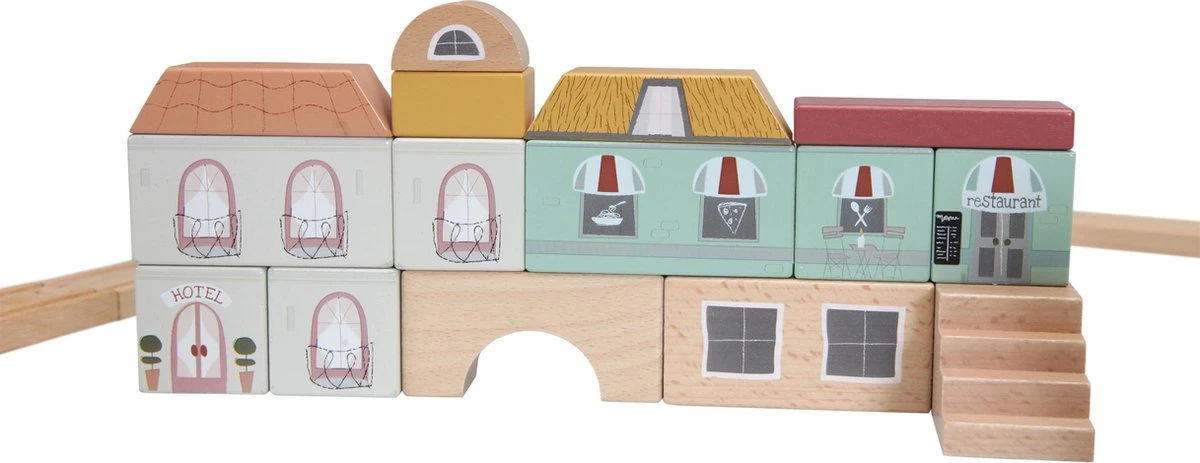 Deze speelset van Little Dutch is perfect te gebruiken in combinatie met de houten treinset. Het omvat 50 blokken om stadsgebouwen te creëren, zoals winkels, een hotel en een restaurant. Kinderen zullen genieten van het combineren van de verschillende bouwelementen, wat het spelen met deze blokken zo leuk maakt. Maak de stad compleet met de spoorwegtrein XXL-set en extra uitbreidingssets voor urenlang speelplezier.
