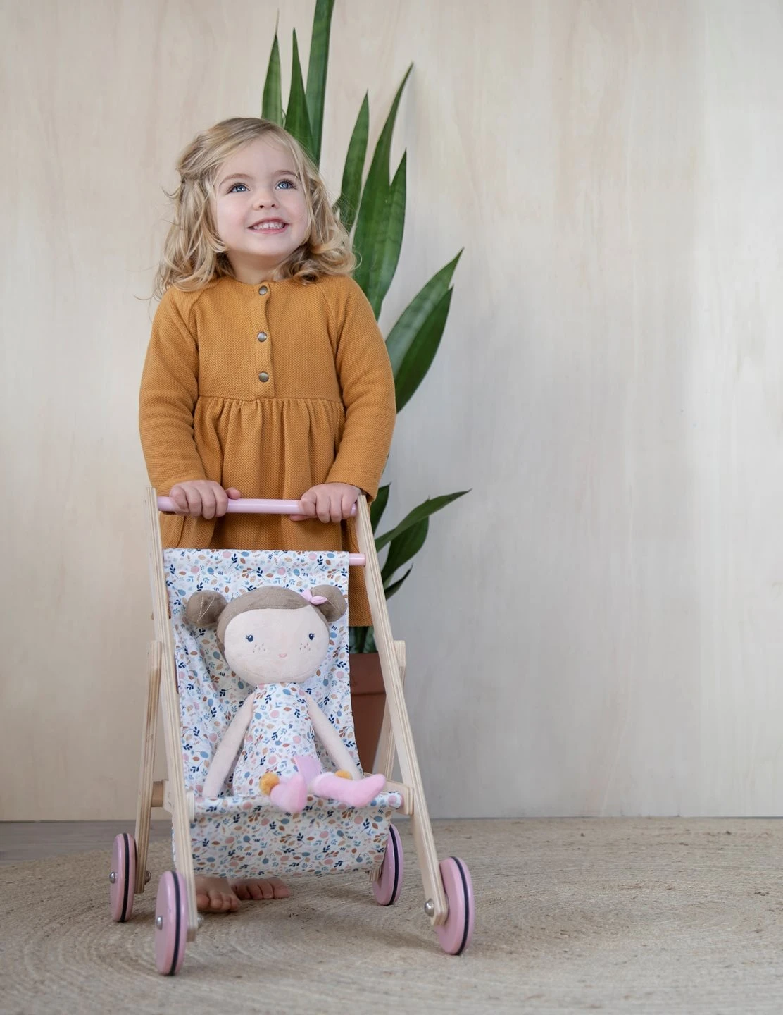 Neem je pop mee voor een wandeling! De houten poppenbuggy heeft een schattig Spring Flowers dessin.