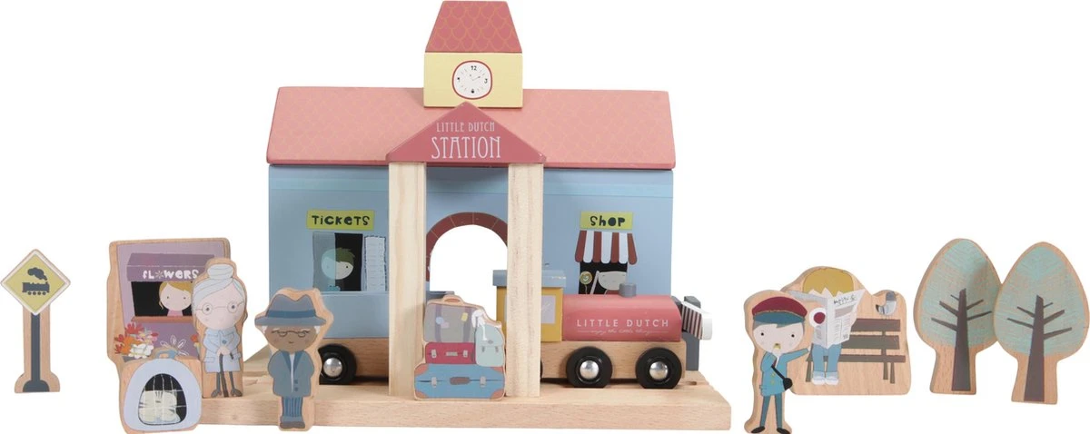 Laten we op een avontuurlijke trip gaan! Pak je spullen, neem je huisdier mee en spring op de volgende trein. De uitbreiding bevat een kiosk, conducteur, reizigers, bomen, koffers, kattenmandje, stationsklok, trein, locomotief en treinstation. Dit houten treinstation is één van de vele speelsets die aan de treinbaan XXL van Little Dutch gekoppeld kan worden. De houten figuren hebben gedetailleerde illustraties aan beide kanten en kunnen in de treinwagon geplaatst worden voor een leuke rit. Je maakt het treinstation helemaal af met de treinbaan XXL en de uitbreidingssets voor uren speelplezier. x