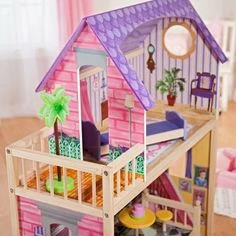 Houten poppenhuis van Kidkraft met 3 verdiepingen met een kleurrijk design. Geschikt voor (barbie)poppen tot 30 cm. Compleet met 11 meubelstukken. Zorgt voor uren speelplezier.