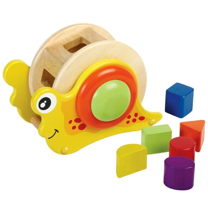 Slakkenhuis van rubberhout met 6 geometrische vormen. Het slakkenhuis rolt. Lengte 18 cm.
